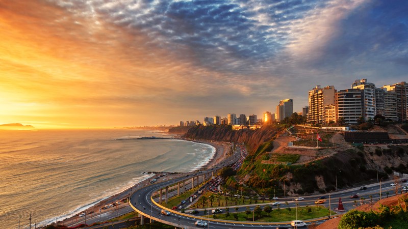 Lima, Peru along the coast also known as Circuito de Playas de la Costa Verde at a golden hour sunset